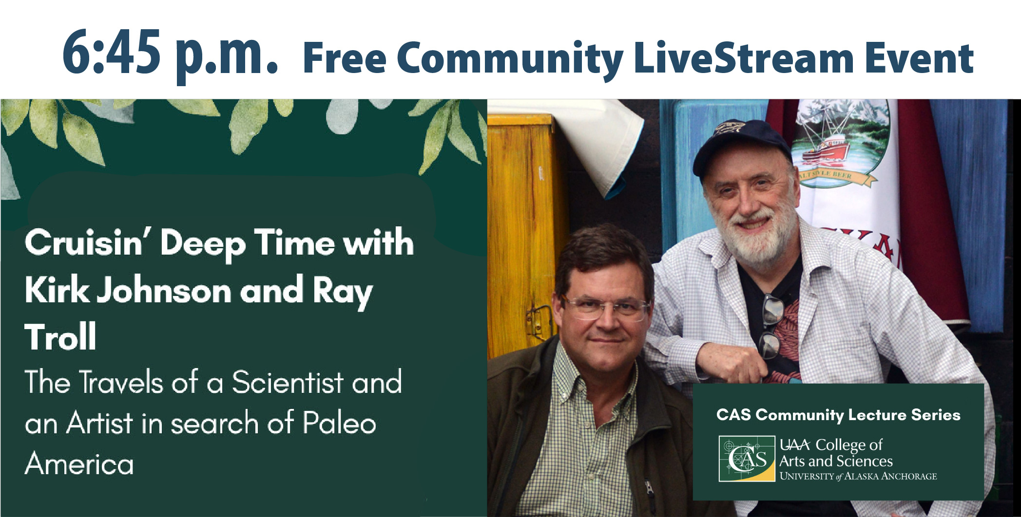 Join us for a special community watch party at the Alaska SeaLife Center as we livestream Cruisin’ Deep Time with Ray Troll & Kirk Johnson: The Travels of a Scientist and an Artist in search of Paleo America from Anchorage's Alaska Center for the Performing Arts – part of the University of Alaska Anchorage’s CAS Community Lecture Series. The stream will take place in the Bear Mountain Conference Room and will be displayed on a large screen for group viewing.